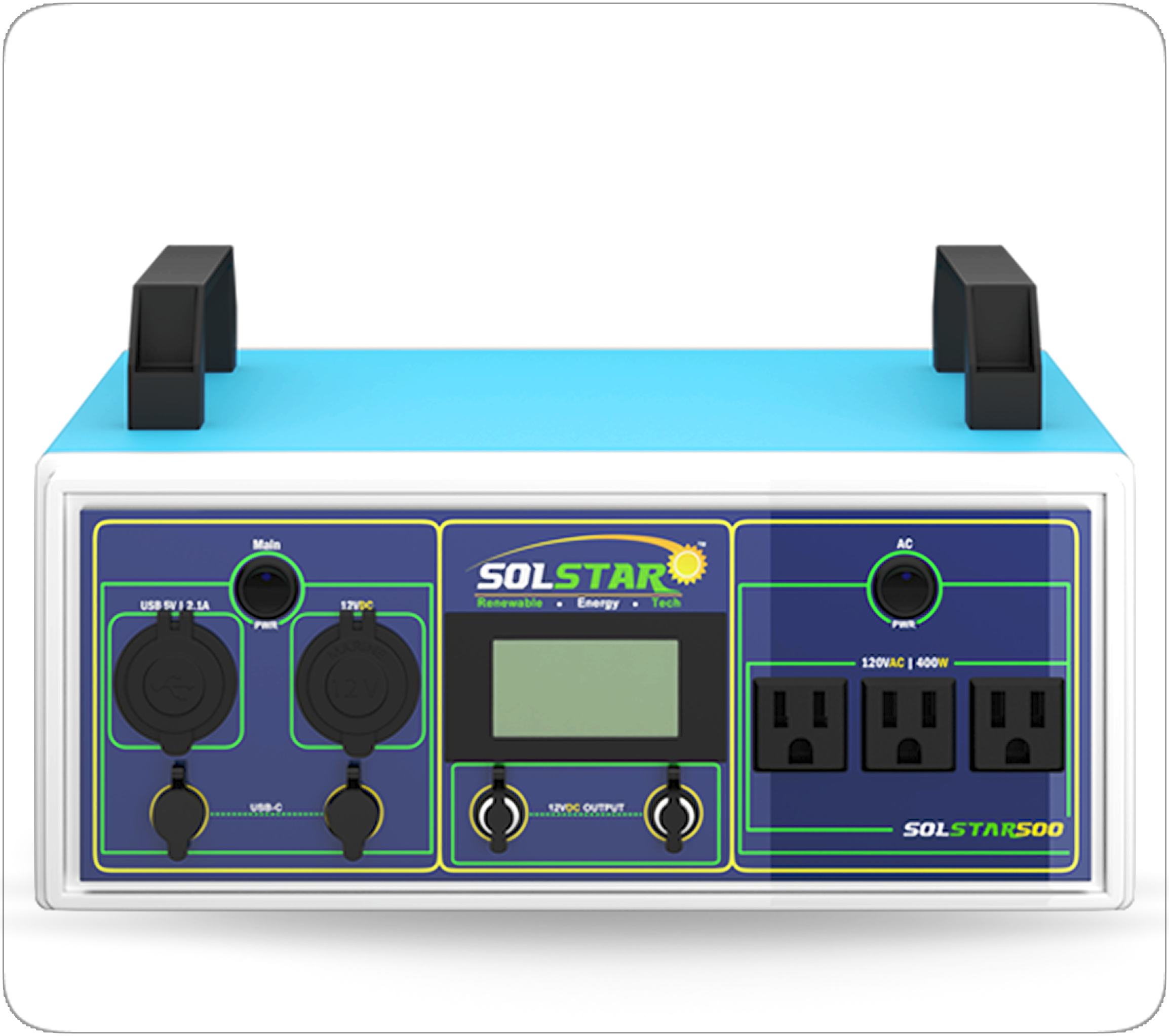 The SOLSTAR500 is equipped with three US standard 110-120V AC outlets that draw up to 500 watts of power, 4 USB ports, 2 Type-A and 2 Type-C and other accessories.